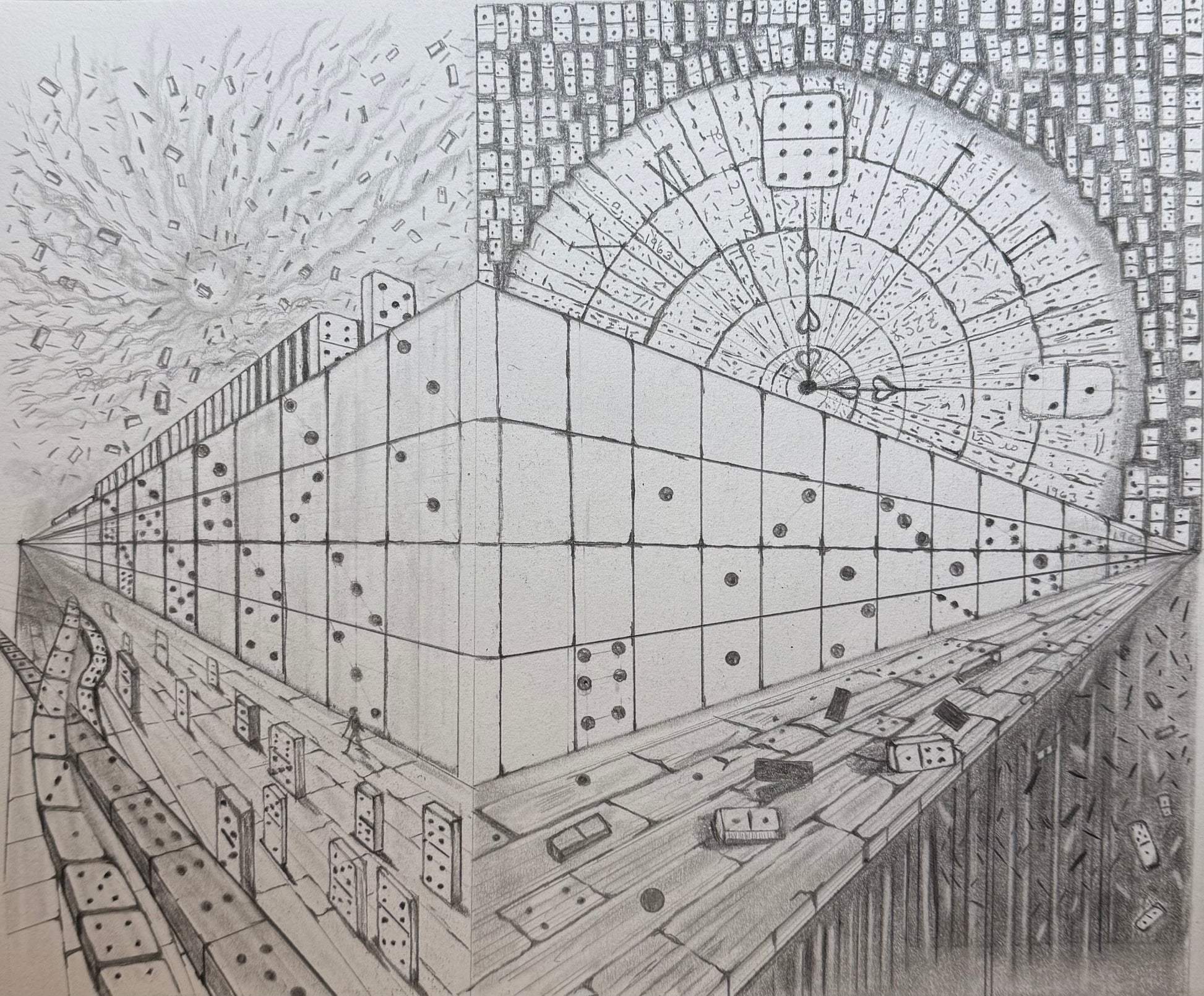 In this surrealistic dreamscape, the architecture of fate is built from dominoes—symbols of randomness and consequence. A lone figure walks a precarious path paved with dominoes, each step a gamble into the unknown. Towering walls of stacked dominoes form a labyrinthine city, while a circular motif on the right evokes a cosmic roulette wheel, blending time and probability. Dominoes lie scattered among the chaos, some toppling, others frozen mid-fall—echoes of decisions made and yet to come. Above, dominoes rain from the heavens in an explosive burst, suggesting that even the sky conspires in the game of chance. This sketch invites viewers to ponder the delicate balance between control and surrender in the architecture of destiny.