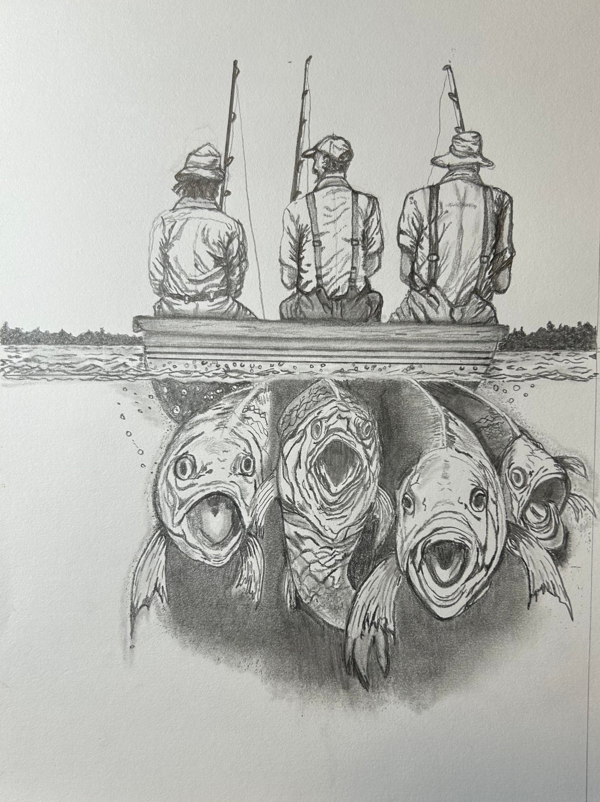 Clowning The Fishermen - This finely detailed pencil drawing captures the serene experience of fishing, while revealing the lively world beneath the surface. Three figures sit on a wooden boat, their backs turned to the viewer, dressed in suspenders and hats as they patiently cast their lines into the water. The simplicity of the moment above contrasts with the animated expressions of four large fish below—each gazing upwards, laughing, seemingly curious, amused, or perhaps even anticipating the outcome of the day's catch.